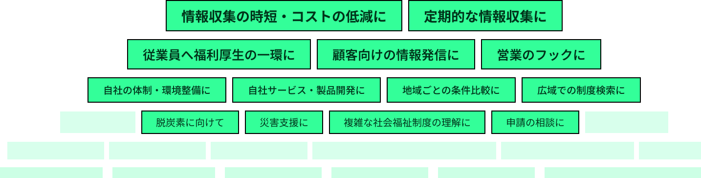 全国規模の支援情報を高い鮮度で保ちつつ、ニーズに合わせて柔軟にカスタマイズ。サービス開発・提供を強力に支援します。